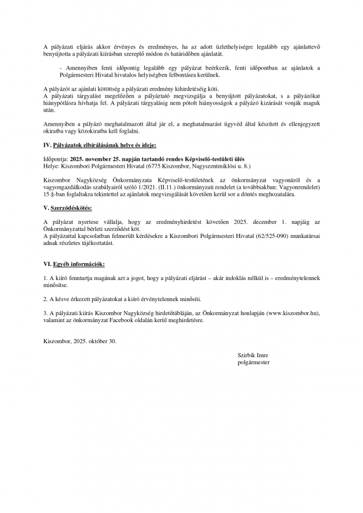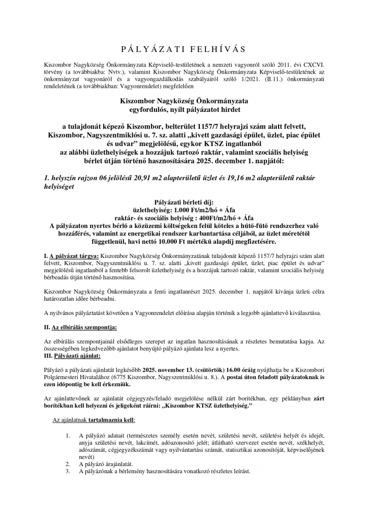 A Kiszombor Község Képviselő-testülete 2025. szeptember 11-én zárt ülésen tárgyalta a "Szegedi utca 1. szám alatti üres helyiség hasznosítására beérkezett kérelmek elbírálása" című előterjesztést, és 2025. szeptember 15-től bérbe adja a helyiséget a HODAJ Kft.-nek (6900 Makó, Kossuth Lajos utca 21.) kenyér és frissen pékáru gyártása és értékesítése céljából.